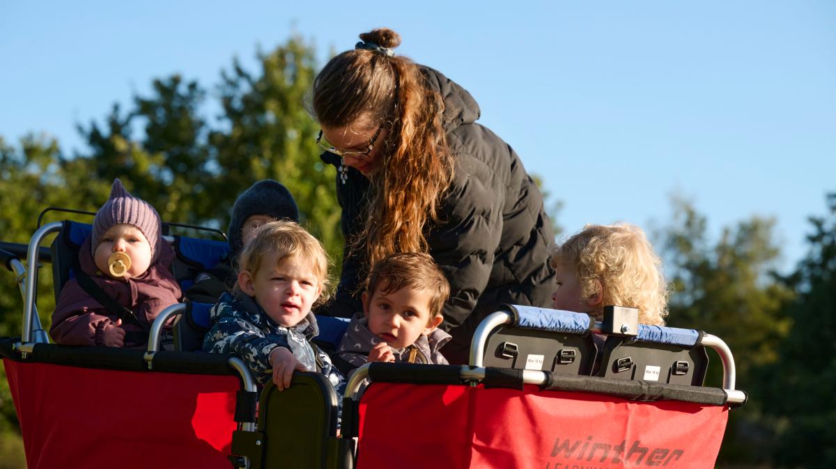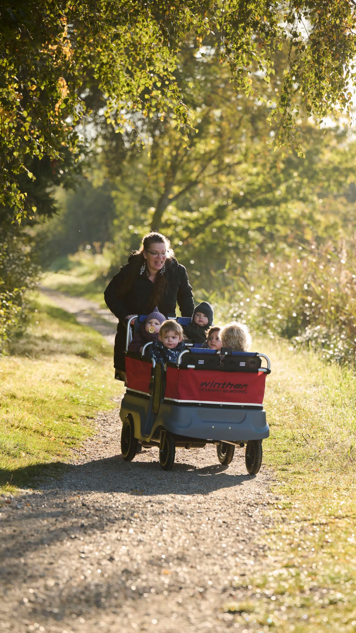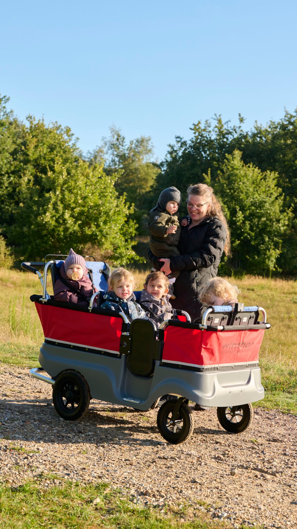 The Turtle Kiddy Bus makes children want to go for lots of outdoor rides. It makes outdoor activities easier and safer for both children and adults. The Kiddy Bus is not only robust, it also features a well-thought-of design that focuses on safety, durability and ergonomics. It is combined with a number of practical details and - of course - room to do what children do. The children sit in pairs opposite each other, making it easy to talk with their friends. They get in and out through a side door, just like in a real bus. It is fun for children, and it saves adults the strain of repeated heavy lifting.
